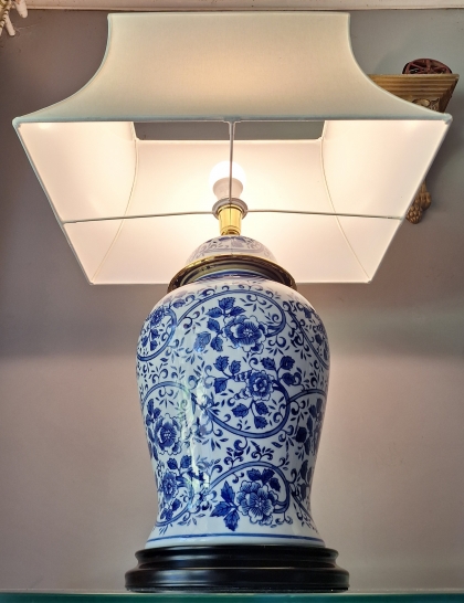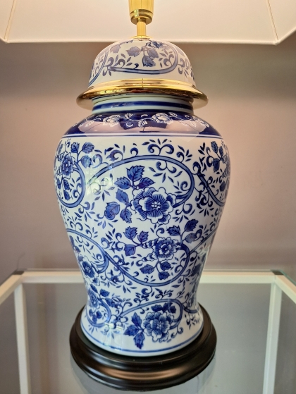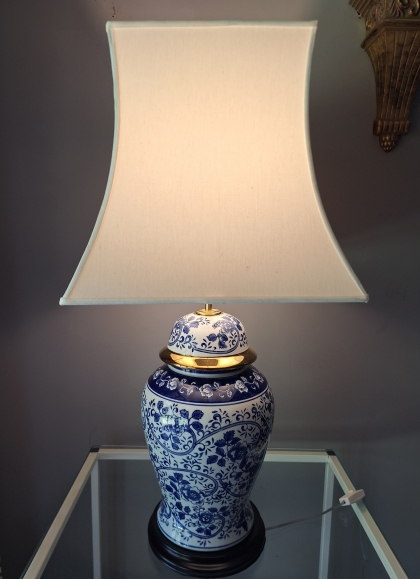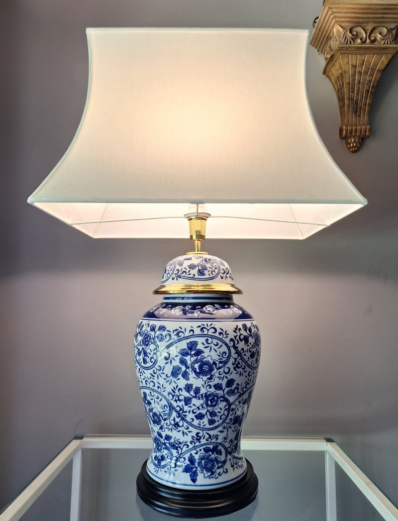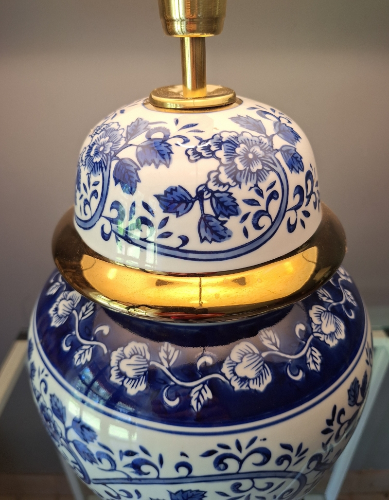 Abajour Chinoiseri, Vintage, Blue and White, Temple Jar, lindo desenho floral, com realce dourado e com base de ebony.