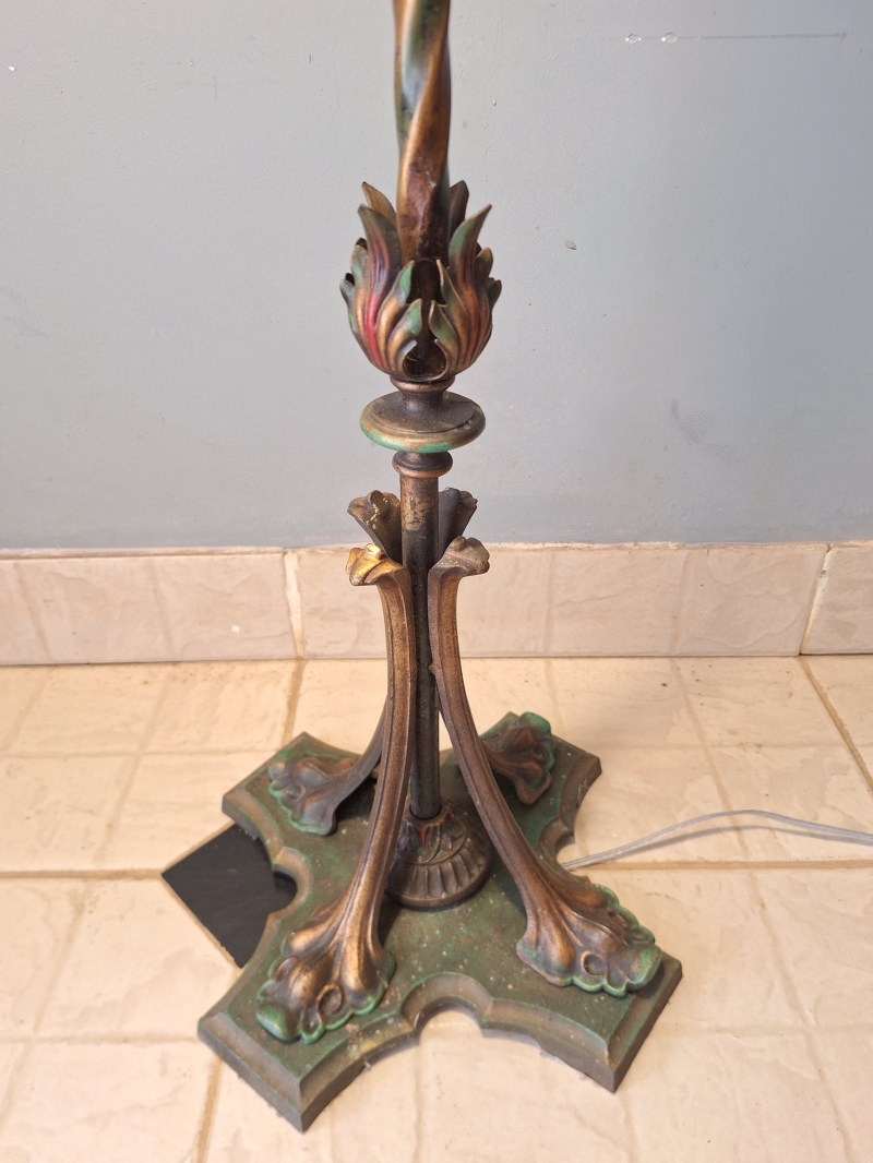 Antique Art Nouveau Cast Iron Floor Lamp (1918), com lindos detalhes em verde, vermelho, e dourado.